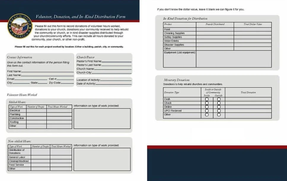 If the printable version is used, we ask that you please have your identified volunteer coordinator, church secretary, or delegated helper input your information into our online form (above) after your site has settled down. We must collect data to help FEMA determine the funds that will flow back into your community. Data = $ in your community’s pocket. Contact Reach Out America with questions or assistance.